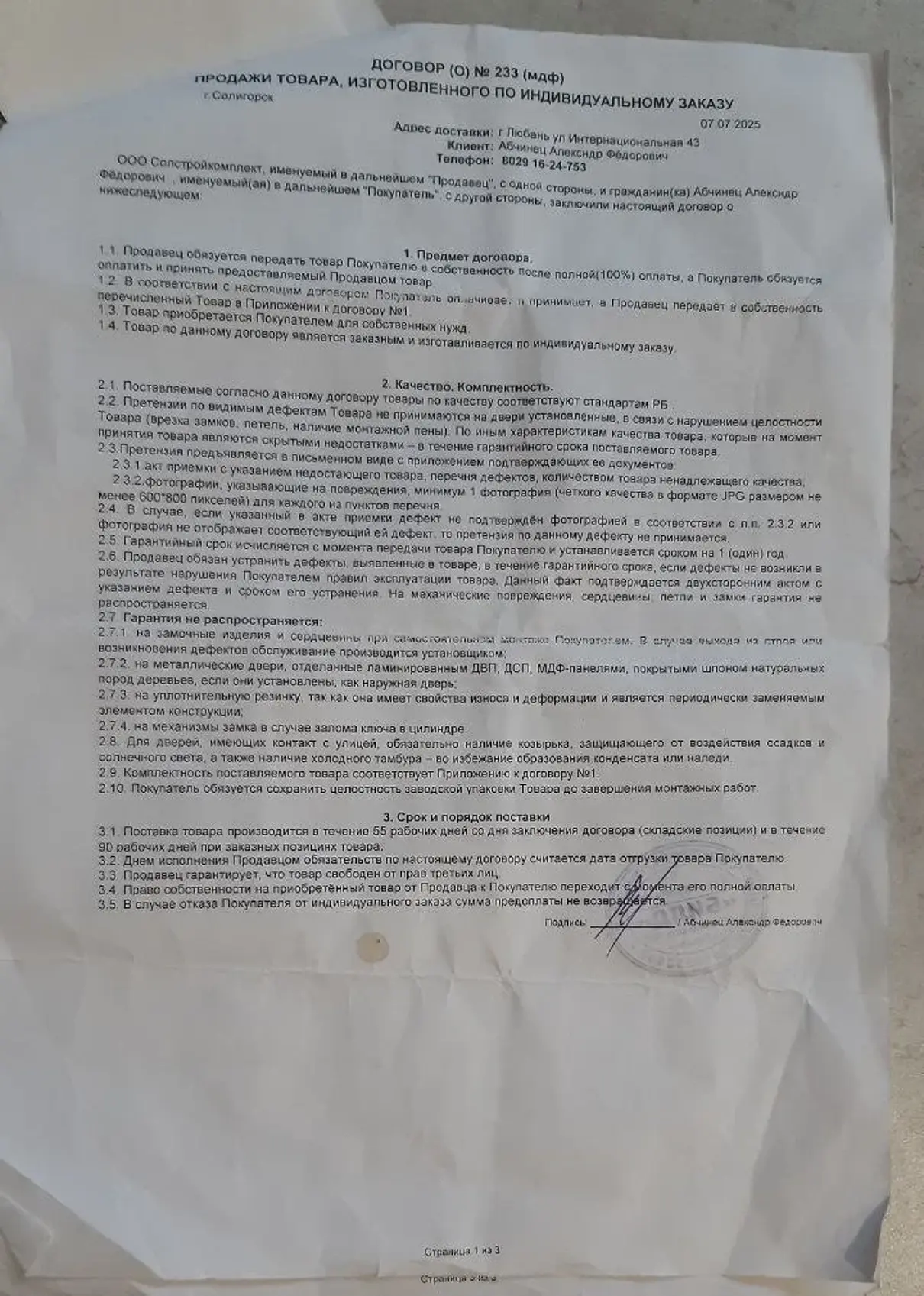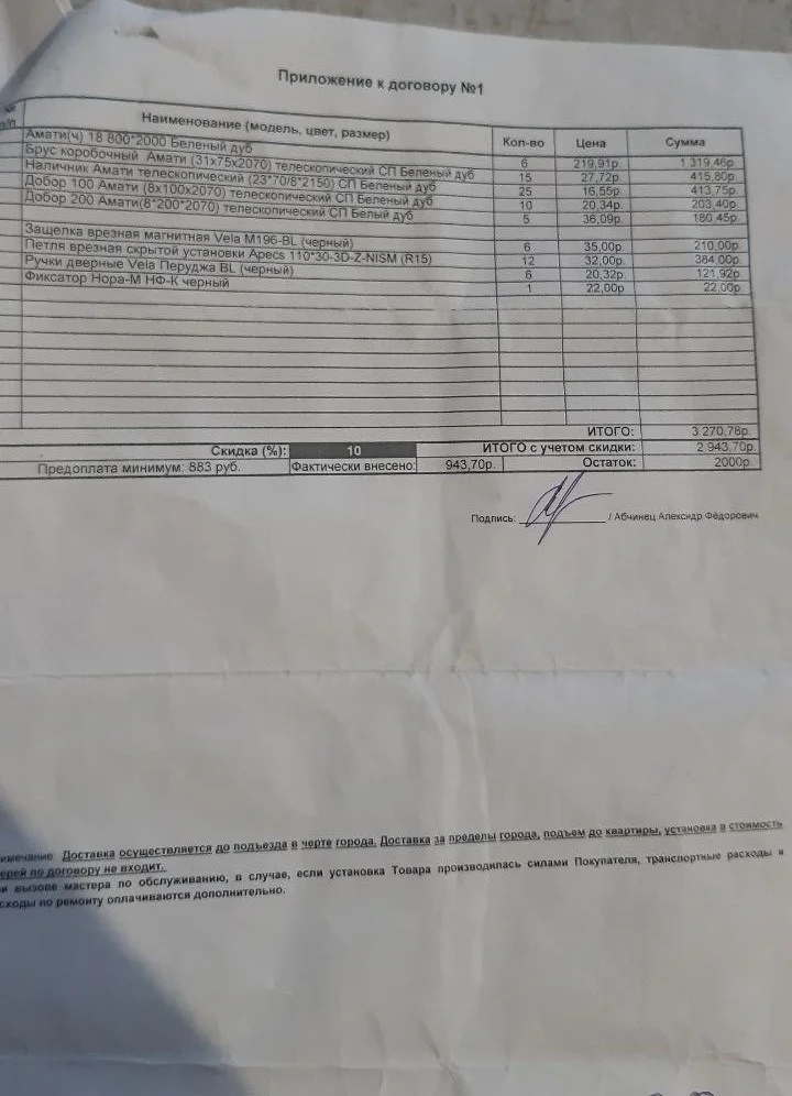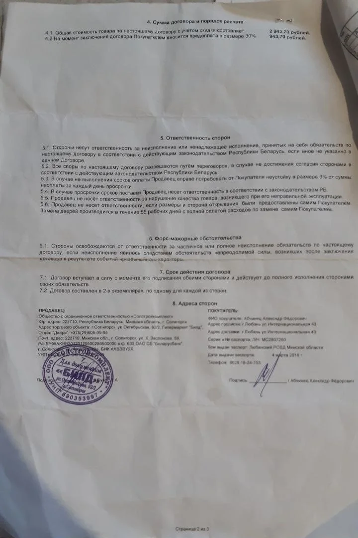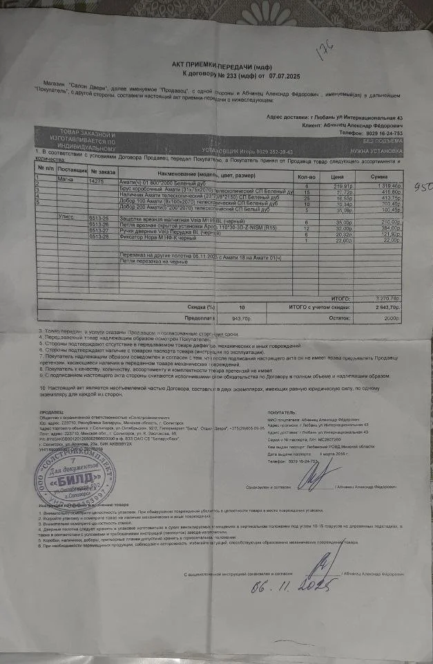 07 июля 2025 года между мной и ООО «Солстроймаркет» (магазин «БИЛД», г. Солигорск) был заключен договор купли-продажи на изготовление и поставку межкомнатных дверей. Общая стоимость заказа составила 2943,70 белорусских рублей, из которых мной была внесена предоплата в размере 943,70 белорусских рублей.