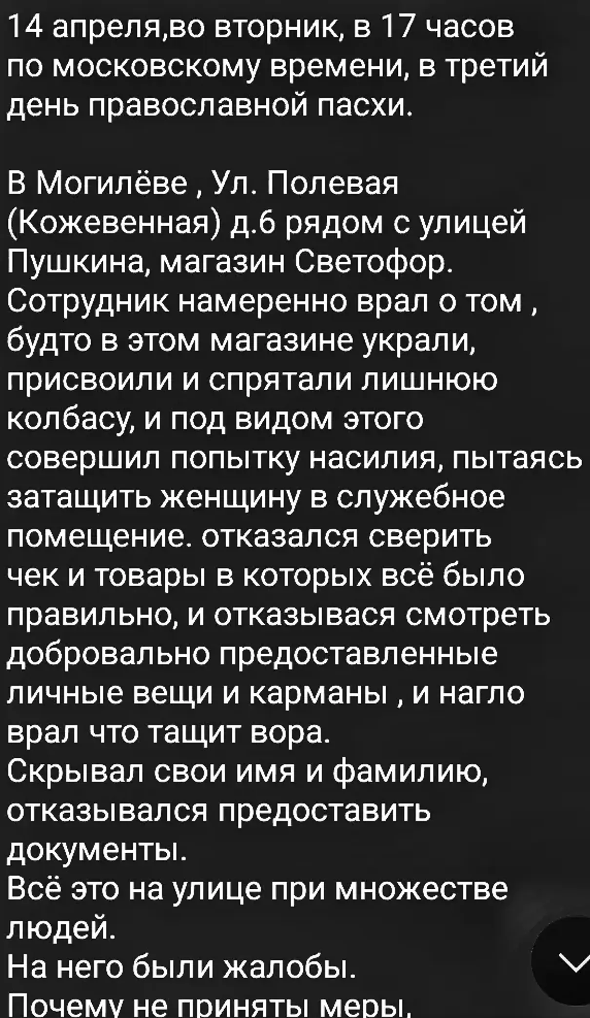 Оказывается, он не оповестив никого, не нажав кнопку, просто выбежал инкогнито, и применил враньё и попытки насилия ко мне, пытаясь затащить меня куда то, не в магазин, а в какуюто каморку.