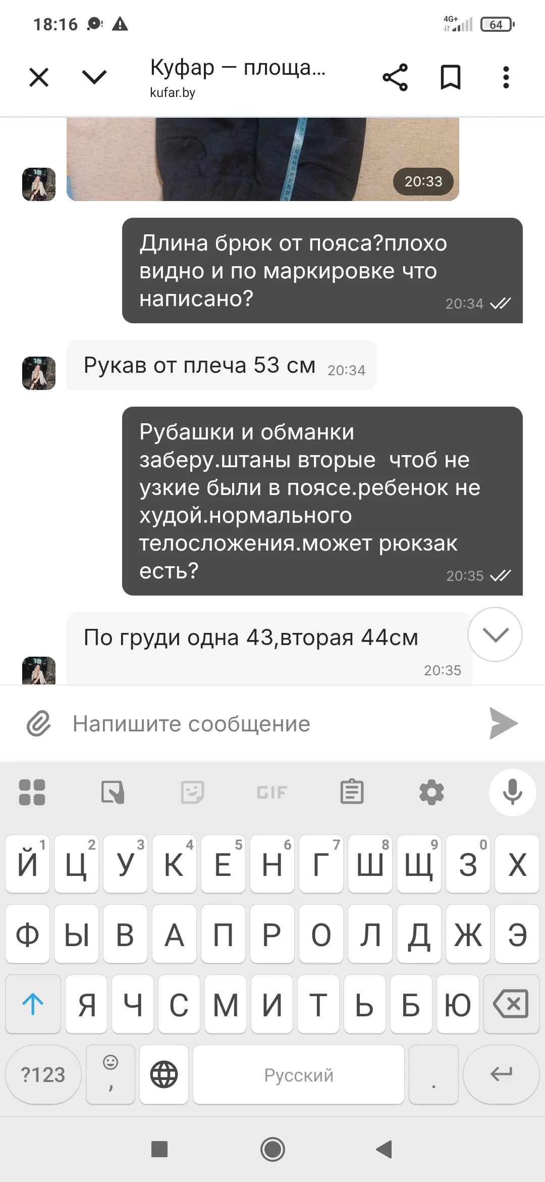 Я уже писала жалобу на этого человека хочу вернуть свои деньги! она продала мне вещи под предлогом мало б/у.всеигрязные.шианы на коленках рваные.не соответствуют описанию и размерам.выставляет одни.а продает совсем другие грязные и вонючие.все в шерсти.фото сверху что высылает.а снизу которые выставляет на продажу.скрины из переписки.телефлн ее нигде не указан